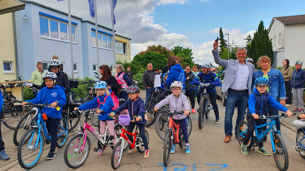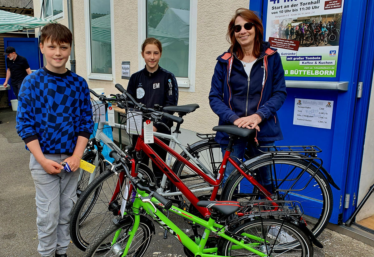 Kurt Sauerborn nahm im Auftrag des Bürgermeisters die Ehrung verschiedener Teilnehmer bzw. -gruppen vor: Die jüngsten Fahrradfahrer waren Nelia Arras (5) und Anton Geisler (3), sie erhielten jeweils einen Pokal für ihre tolle Leistung. Mit 87 Jahren war Erika Sack die älteste Teilnehmerin und wurde dafür mit einem Blumenpräsent geehrt. Adam Astheimer (88) erhielt als ältester Teilnehmer ein Weinpräsent des Weinguts Oswald. Die größte externe Gruppe waren wieder die Naturfreunde mit 26 Radfahrern und die größte vereinsinterne Gruppe waren die Handballer mit 84 Radlern. Sie erhielten ebenfalls ein Präsent zur Stärkung. Die Spannung stieg, als die Fahrräder, gestiftet von der Firma Fahrrad Küchler, Mörfelden-Walldorf, der Firma Holzbau Hirsch und der Firma Landschaftsbau Klink, verlost wurden. „Glücksfee“ war die kleine Lia, die die Gewinner souverän zog: Gewinner des Herrenfahrrads war Emilia Mertke, das Damenfahrrad durfte Ina Hamm mit nach Hause nehmen und über den dritten Preis, ein apfelgrünes Kinderfahrrad, freut sich nun Jonah Kaupe, der es, weil es für ihn zu klein ist, einem seiner Geschwister schenken wollte.