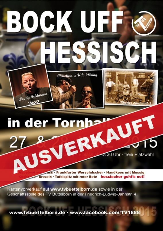 Die beiden Veranstaltungen "Bock uff Hessisch" am 27. & 28. März sind ausverkauft. Wer noch Kartenwünsche hat, kann sich gerne mit uns per E-Mail an tickets@tvbuettelborn.de in der Verbindung setzen. Wir nehmen die Bestellung dann auf der Warteliste auf. Sollte jemand Karten zurückgeben wollen, so werden in der Reihenfolge der Warteliste die Karten entsprechend vermitteln.