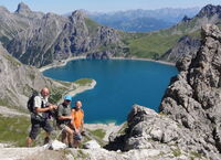 Gestartet wurde am Donnerstagmorgen in aller Herrgottsfrühe mit zehn Mann und drei Autos in Richtung Brand zur Lünerseebahn. In wenigen Minuten waren wir auf 1979 m Höhe und wurden vom Team der Douglasshütte herzlich empfangen. Dramatische Wolkenbilder über dem See und in den angrenzenden Gebirgen konnten uns nicht davon abhalten den Lünersee in den frühen Abendstunden komplett zu umrunden. Hierbei konnten schon erste Ziele für die beiden nächsten Tage ausgemacht werden.