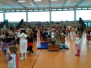 Die Fastnacht ist jetzt zwar schon ein paar Tage rum, doch wir wollen den Lesern diesen Rückblick nicht vorenthalten. Traditionell veranstaltete die Turnabteilung am Mittwoch vor dem Faschingswochenende ihre Faschingsturnstunde für alle aktiven Kinder der Abteilung. Rund 120 Kids im Alter von vier bis zwölf Jahren in kunterbunten Kostümen hatten großen Spaß bei der zweistündigen Faschingsveranstaltung. Viele Spiel- und Kletterstationen hatten die als Indianer verkleideten Übungsleiter zuvor in der Kreissporthalle aufgebaut. Große Freude kam auch bei der Polonaise zu fetziger Faschingsmusik auf. Zur Stärkung gab es bei einer kleinen Pause leckere Laugenbrezeln und Orangensaft.