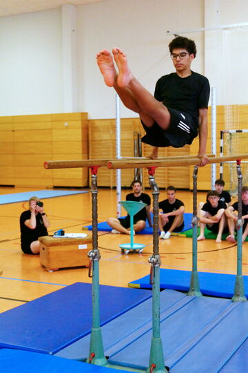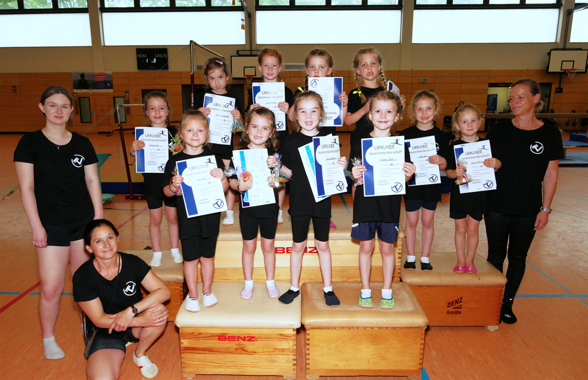 Ab 13 Uhr wurden die Vereinsmeisterschaften der über 8-jährigen in insgesamt 10 Wettkämpfen für verschiedene Alters- und Schwierigkeitsstufen durchgeführt. Es wurde ein klassischer Geräte-Vierkampf geturnt wobei nur die drei besten Geräte in die Wertung eingegangen ist. Die Aufregung war egal ob jung oder alt groß. Während die Übungen am Gerät geturnt wurde, konnten alle Zuschauer erkennen, dass die vielen Jungs und Mädels, sehr viel Spaß an der Wettkampfform hatten und die gelernten Übungen zum Großteil super geklappt haben. Die jüngeren Kids staunten nicht schlecht, als die ältesten Turner ihre Sprünge über den Sprungtisch zeigten. Ob Radwende, Handstützüberschlag oder sogar einen Handstützüberschlag mit halber Drehung von Vereinsmeister Corbinian Barthel brachten großen Applaus.
