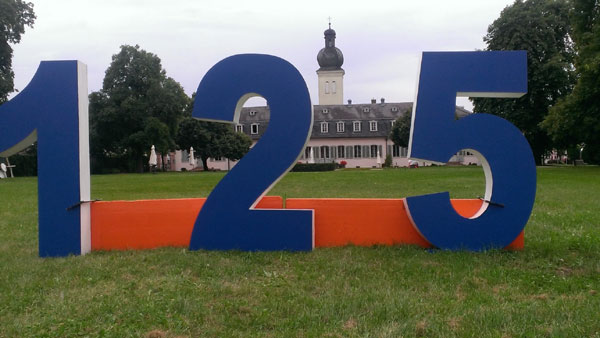 Die Zahlen Eins-Zwei-Fünf, gebaut von der Schreinerei Jockel anlässlich unseres Jubiläums im vergangenen Jahr, gehen auf Reisen. In diesem begleiten die drei Ziffern den TSV Braunshardt, der im Jahr 1889 gegründet wurde. Auf dem Foto ist im Hintergrund das Broischter Schloss zu sehen, wo vor kurzem die Feierlichkeiten stattfanden. Wünschen wir der 125 alles Gute...