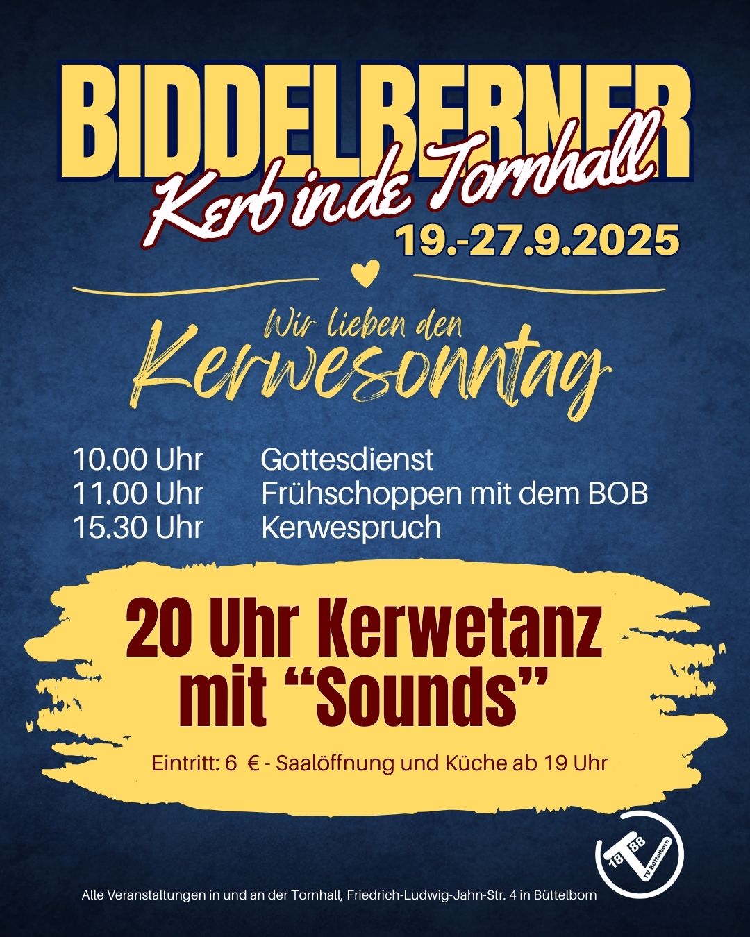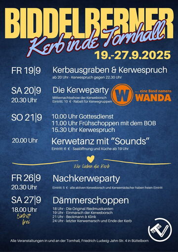 Das Wetter wird langsam herbstlich – beste Voraussetzungen, um sich auf die Biddelberner Kerb zu freuen. Diese beginnt nämlich schon in einer Woche, nämlich am kommenden Freitag mit dem Kerbausgraben in der Tornhall. Wir hoffen, dass das ganze Örtsche wieder unterwegs ist, um das große Fest in der Gemeinde zu feiern. Der Turnverein Büttelborn und die Kerweborsch vun de Tornhall haben allerlei Programm vorbereitet.