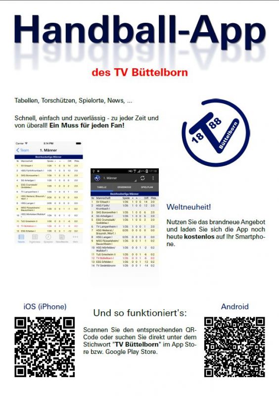 Du willst immer aktuell über alle Spiele und Ergebnisse der Handballmannschaften vom TVB informiert sein? Dann hole Dir jetzt die neue TVB-Handball-App für das Smartphone oder I-Phone. Im App-Store einfach nach „TV Büttelborn“ suchen. Die App ist natürlich kostenlos. Neben den Spielterminen und Ergebnissen sind auch immer die aktuellsten News von den TV-Handballern darin zu finden. Es lohnt sich.