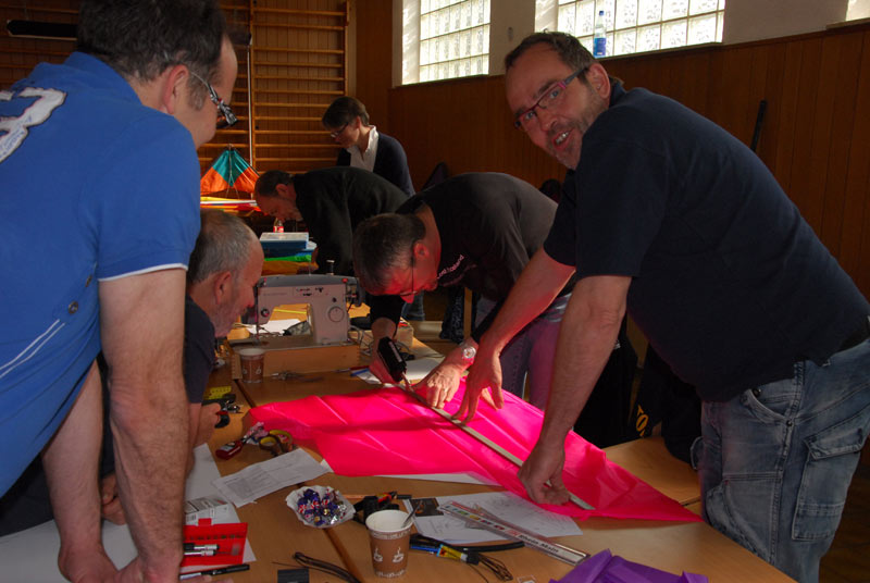 Am 13.04.2014 haben sich im Gymnastikraum sechs Drachenbauinteressierte eingefunden, um unter fachkundiger Anleitung von Christian Harms einen Speedwing (Lenkdrachen) selber zu bauen, zu nähen. Nach einem kleinen Materialkundevortrag ging es an die Auswahl der Farbdesigns und so manch einer der Teilnehmer bewies Mut zur Farbe, aber auch unsere traditionellen TVB-Farben gelb-blau wurden favorisiert. Bevor es aber ans Nähen ging, mussten die Schablonen anhand des Bauplans erstellt werden. Nach dem die Segelteile zugeschnitten waren zeigten sich die Tücken der Tuchwahl. Je dunkler die Tücher waren um so schlechter konnten die Linien erkannt werden auf denen akkurat entlang genäht werden musste. So manch einer hatte da die Gelegenheit, Bekanntschaft mit dem Nahttrenner zu machen und die Nähte noch mal zu nähen.