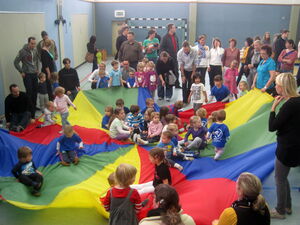 Anlässlich des 125-jährigen Vereinsjubiläums veranstaltete der TV Büttelborn am letzten Sonntag einen Familientag in der vereinseigenen Turnhalle. Schon kurz vor der offiziellen Eröffnung um 10 Uhr fanden sich viele Kinder (1 bis 5 Jahre) mit Mama/Papa/Oma und Opa in der TV Halle ein. In einer Bewegungslandschaft, die von Leni Nau, Heike Neumann und vielen Helfern gestaltet wurde, konnten sich die Kleinen austoben. Ein gemeinsames Lied auf dem Fallschirm aller Kinder beendete den ersten Teil. Als nächstes wurde ein Handball- und Turn-Parcours für die etwas größeren aufgebaut. Eine Urkunde für alle Teilnehmer war das Ziel der Kinder.