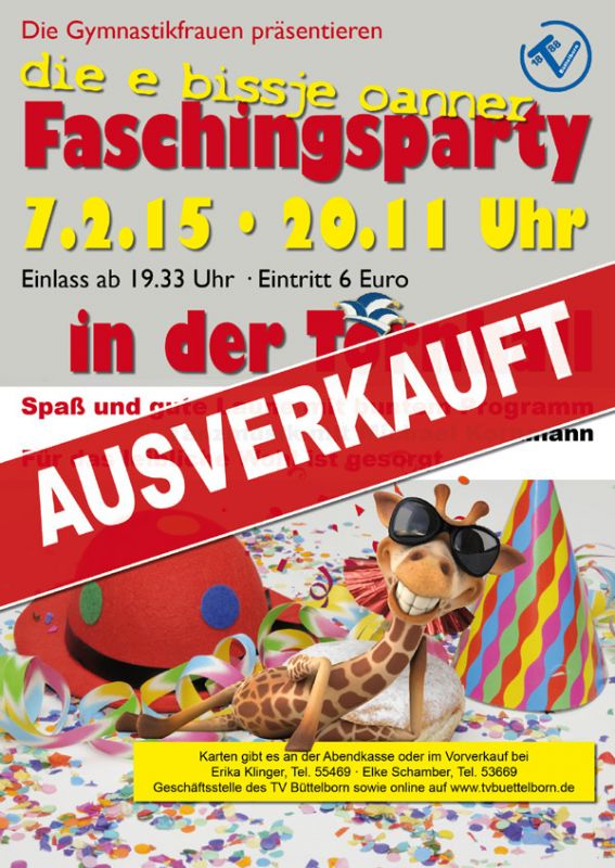 Die Faschingsparty der Gymnastikfrauen findet am Samstag, dem 7.2.2015 um 20:11 in der Tornhall statt. Einlass ist ab 19.33 Uhr. Eingeladen sind alle, die neugierig sind auf eine etwas andere Faschingsveranstaltung und die einen lustigen und kurzweiligen Abend verbringen möchten. Für das leibliche Wohl wird selbstverständlich gesorgt sein. Das Programm beinhaltet Sketche, Büttenreden, Gesang, Tänze und viel Musik von Michael Kornmann zum Schunkeln und Tanzen.