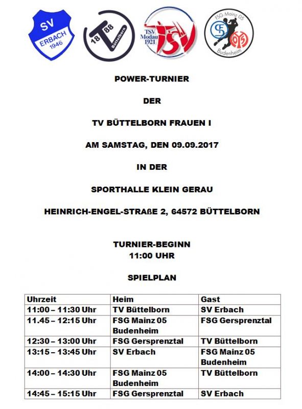 Zu Gast sind die Handballdamen des SV Erbach, der FSG Mainz 05 Budenheim sowie der FSG Gersprenztal. Alle Teams treten gegeneinander an und spielen je 30 Minuten. Die Damen freuen sich über viele Zuschauer, die zum Anfeuern in die Halle kommen. Für Essen und Getränke ist gesorgt.