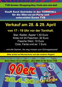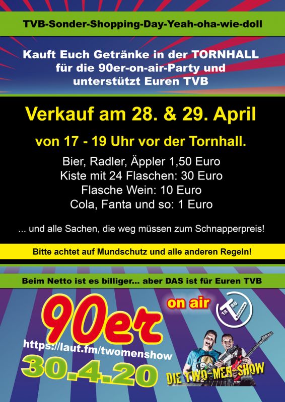 Da die Getränke im Kühlhaus mit der Zeit nicht besser werden, gibt es am Dienstag und Mittwoch (28. & 29.) einen Getränkeverkauf vor der Tornhall. Mit dem Kauf unterstützt Ihr Euren TVB. Holt Euch zwei Fläschchen Bier für den 30.4. oder en guude Woi zum Spargel am 1. Mai... Es gibt auch ein paar Getränke, die leicht über das MHD sind - diese gibt es natürlich zum Schnapperpreis!