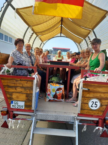 Am 30. Juli wurde ein Traktor mit Planwagen gechartert. Oliver fuhr uns mit seinem „Schlüter“ durch die Büttelborner, Weiterstädter und Griesheimer Gemarkung. Mit Weck, Worscht und Sekt waren wir fast 3 Stunden unterwegs. Ilse sorgte mit der richtigen Musik (natürlich Schlager, die wir alle kennen) für die Stimmung. Für viele Spaziergänger war der Planwagen mit den Girls ein Highlight.