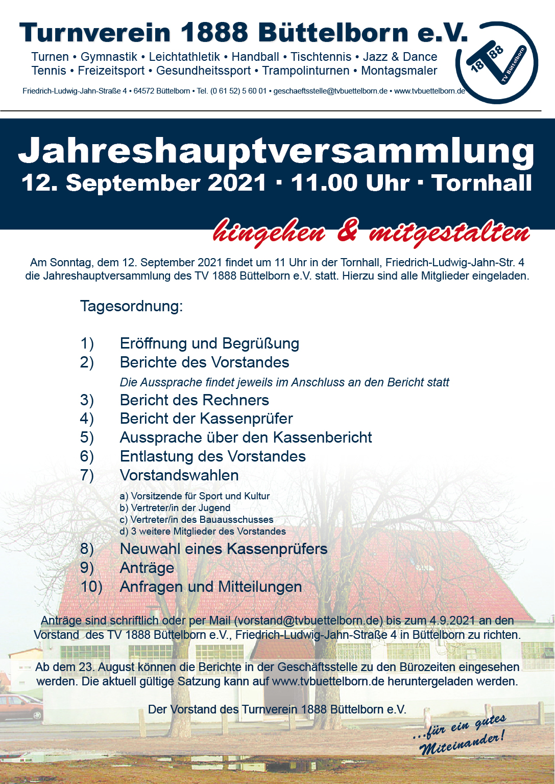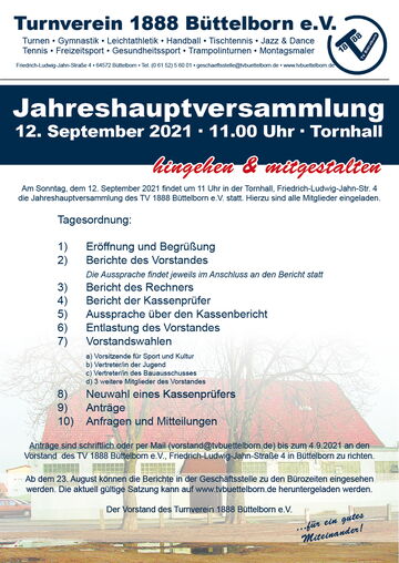 Am Sonntag, dem 12. September findet um 11 Uhr in der Tornhall die diesjährige Jahreshauptversammlung statt. Hierzu sind alle Mitglieder recht herzlich eingeladen.