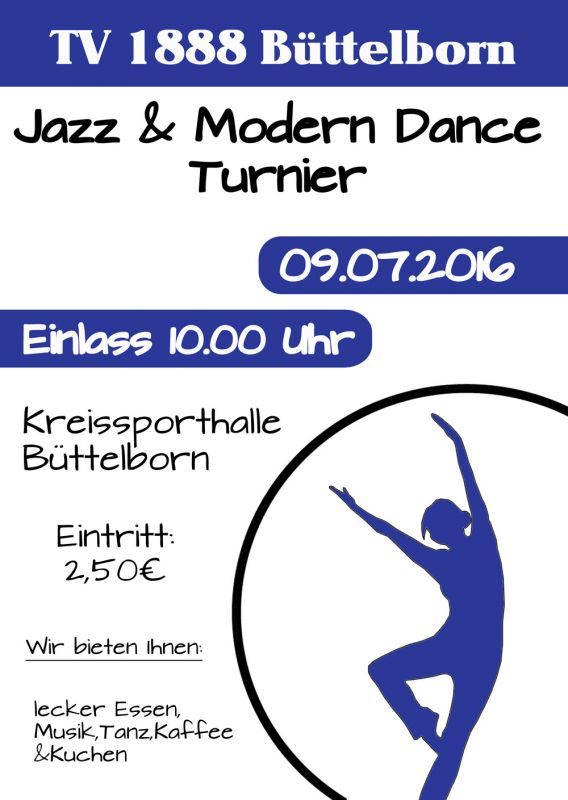 Bereits zum dritten Mal richtet der TV Büttelborn ein Jazz- und Modern-Dance-Turnier aus. An diesem Samstag (9.) werden am 10 Uhr in der Büttelborner Kreissporthalle über 430 Teilnehmer erwartet, die mit ihren Formationen auf der Tanzfläche in verschiedenen Kategorien antreten werden. Die Zuschauer können sich auf tolle Tänze freuen. Der Eintritt beträgt 2,50 €