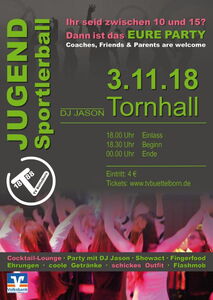 Am Samstag steigt unser erster Jugendsportlerball in der Tornhall. Über 130 Karten haben wir im Vorverkauf schon verkauft, es ist aber noch Platz in der Tornhall. Das soll aber nicht so bleiben. Also, liebe Eltern... schickt Eure Kids am Samstag in die Tornhall, kommt selbst mit, bringt Freunde mit und lasst uns einen tollen Abend für unseren Nachwuchs auf die Beine stellen. Karten zum Preis von 4 Euro gibt es an der Abendkasse, wer einen ganzen Tisch (8 Plätze) reservieren will (sind nicht mehr viele!!!), kann hierfür das Bestellformular benutzen und die Karten vorbestellen. Diese werden dann an der Abendkasse hinterlegt.