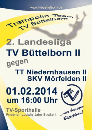Unser Trampolin-Nachwuchs startet am morgigen Samstag zu Hause in der TV-Sporthalle in die 2. Landesliga. Gegner sind die SKV Mörfelden II und die TT Niedernhausen II. Der TVB muss ohne Louis Behre auskommen, der in die Oberliga-Mannschaft aufgerückt ist. Dennoch hoffen die Trainer auf einen Auftakterfolg. Beginn ist um 16 Uhr, für Kaffee und Kuchen ist bestens gesorgt. Die junge Mannschaft freut sich über viele Zuschauer.