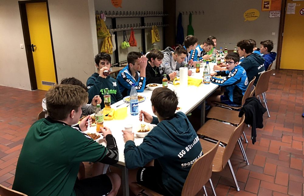 Unsere JSG-Handballer der männlichen C-Jugend sind nach der Weihnachtspause gleich am 2. Januar mit der Vorbereitung auf die Rückrunde gestartet. Zwei normale Einheiten am Dienstag und Donnerstag bildeten den Aufgalopp für den Trainingstag am Samstag. Der Startschuss um 10 Uhr morgens war für den ein oder anderen sichtlich früh nach zwei Wochen Winterferien. Während bei der Morgeneinheit der Schwerpunkt auf Koordination und individuellem Abwehrverhalten lag, wurde im Mittagstraining die Abwehrthematik vertieft und um Angriffselemente ergänzt. Zur Stärkung gab es zwischen den beiden Einheiten ein gemeinsames Mittagessen. Unser Dank geht hierbei an das Gästehaus Jockel.