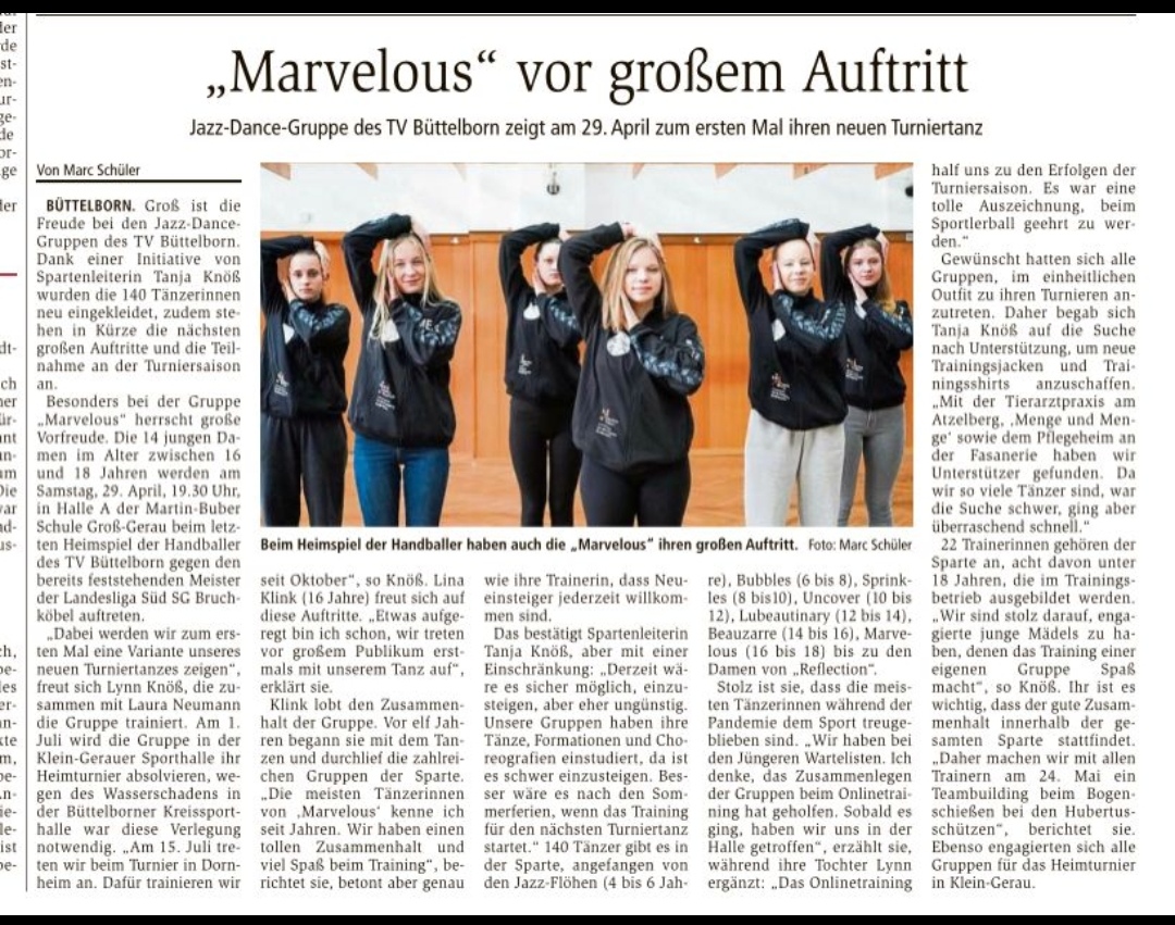 Am 26. April berichtete das Groß-Gerauer ECHO über unsere Sparte Jazz & Dance, die ihren neuen Tanz am letzten Heimspieltag der Handballer am Samstag (29.) in der Groß-Gerauer Martin-Buber-Halle vorführen wird.