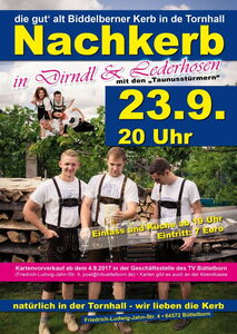 Am Freitagabend laden die Kerweborsch zum 19. Mal zur Nachkerweparty ein, los geht es um 20.30 Uhr. Die Nachkerb in Dirndl und Lederhosen hat sich mittlerweile etabliert. So wir auch dieses Jahr am Samstag (23.) zünftig gefeiert – zusammen mit Kerweborsch und den Taunusstürmern. Wir freuen uns auf eine schöne, entspannte Nachkerb in der Tornhall. Beginn ist um 20 Uhr, der Saal und die Küche öffnen bereits um 19 Uhr. Karten zum Preis von 7 Euro gibt es an der Abendkasse.