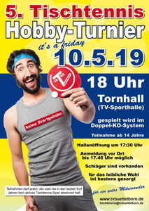 Am kommenden Freitag (10.) findet in der Tornhall das 5. Tischtennis-Hobby-Turnier statt. Um 18 Uhr geht es los. Teilnehmen können alle Hobby-Spieler (auch die Talentfreien) ab 14 Jahren. Die Teilnahme ist kostenlos und die Anmeldung erfolgt ab 17.30 Uhr direkt in der Halle. Schläger werden vom Ausrichter gestellt.