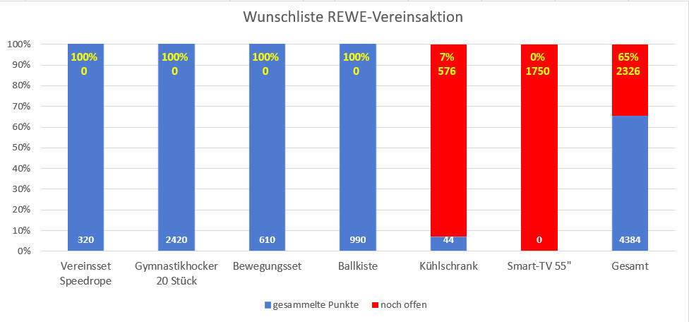 Bei der REWE-Vereinskation haben wir aktuell 4.391 Punkte gesammelt. Dafür werden wir uns neue Rope-Skipping-Seile, Gymnastikhocker für den Seniorensport, ein Bewegungsset für Kinder und eine neue Ballkiste anschaffen. Dafür haben wir schon ausreichend Punkte gesammelt.