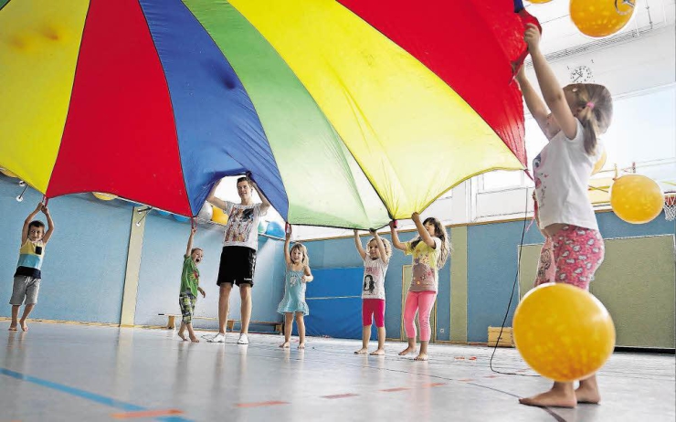 Kraus holt ein buntes Sprungtuch und singt: „Auf der grünen Wiese steht ein Karussell.“ Die Kinder greifen sich das Tuch und laufen im Kreis mal langsam, mal schnell. Manuel Janz, der ab September beim Turnverein ein Freiwilliges Soziales Jahr absolviert, bringt Bälle und wirft sie auf das Tuch, das die Kinder hoch und runter bewegen. Am Ende rollen die Bälle durch die Halle, die Kita-Kinder jagen jauchzend hinterher.