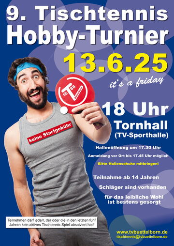 Die Jubiläums-Tischtennisler vom TV Büttelborn laden am Freitag, dem 13. Juni wieder zum Hobbyturnier in die TV-Sporthalle ein. Los geht es um 18:00 Uhr, teilnehmen dürfen alle Hobby-Klepperleute, die in den letzten Jahren nicht aktiv Tischtennis gespielt haben. Eine Teilnahmegebühr wird wie immer nicht erhoben, Anmeldung ist um 17.30 Uhr direkt in der Halle. Bitte vergesst nicht, Hallenschuhe mitzubringen.