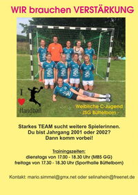 Die weibliche C-Jugend der JSG-Handballerinnen sucht für die kommende Runde noch ein paar Spielerinnen. Die Mannschaft trainiert zweimal die Woche, nämlich dienstags von 17 - 18.30 in der Martin-Buber-Halle in Groß-Gerau und jeden Freitag von 17.30 - 18.30 Uhr in der Büttelborner Sporthalle. Mädchen der Jahrgänge 2000/2001, die dabei sei wollen, wenden sich einfach an die Trainer Mario Simmel und Selina Hein - am besten per Mail an handballjugend@tvbuettelborn.de. Wir freuen uns auf Euch!