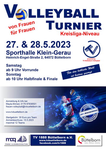 Unsere Volleyballabteilung lädt am 27. & 28. Mai zu einem Volleyball-Turnier für Frauen auf Kreisklassen- & Kreisliga-Niveau in die Sporthalle Klein-Gerau ein. Insgesamt können 12 Teams starten, die am Samstag die Vorkämpfe und am Sonntag das Halbfinale und die Finals austragen. Die Anmeldegebühr beträgt 30 Euro pro Mannschaft.