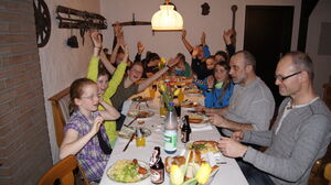 Also schlugen wir die Zelte in der Sporthalle ab und fuhren alle nach Klein-Gerau zu Simmels, die netterweise ihren Partykeller zur Verfügung stellten. Bei Würstchen, leckeren selbst gemachten Salaten und diversen Kaltgetränken ließen wir es uns noch richtig gut gehen. Alles in Einem, ein rundum gelungener Abend, an dem alle Teilnehmer viel Spaß hatten.
