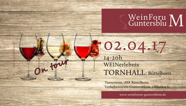 Nach der erfolgreichen Startveranstaltung im letzten Jahr kommt am Sonntag, 2. April in der Zeit von 14 – 20 Uhr das WeinForum Guntersblum on tour wieder nach Büttelborn in die Tornhall.
