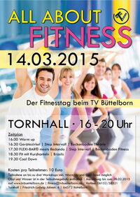 Der Fitnesstag beim TV Büttelborn am Samstag, dem 14. März 2015 von 16 - 20 Uhr in der Tornhall in der Friedrich-Ludwig-Jahn-Straße 4 - schauen Sie vorbei und lernen Sie neue Angebote beim TV Büttelborn kennen. Los geht es um 16 Uhr mit einem gemeinsamen Warm Up aller Teilnehmer. Ab 16.30 Uhr werden verschiedene Kurse á 45 Minuten angeboten.