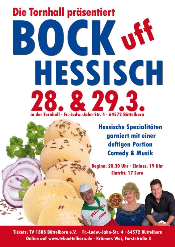 Bock uff Hessisch geht in die nächste Runde. Am 28. & 29. März gibt es nach zwei Jahren Pause wieder die beliebte Veranstaltung in der Tornhall - dieses Mal mit einem etwas geänderten Konzept. Vorneweg: Handkees und Äbbelwoi gibt es wie immer, beim Kulinarischen ist alles beim Alten geblieben. Auf künstlerischer Ebene freuen wir uns, dass wir dieses Mal drei ganz besondere "hessische Spezialitäten" engagieren konnten: Das Trio Olga Orange, Patrick Himmel und Ciro Visone werden das knapp vierstündige Programm gestalten.