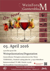 Am 03.April 2016 ist das WeinForum Guntersblum zum ersten Mal on tour. Abweichend zur sonstigen Präsentation werden von 13:00 Uhr bis 19:00 Uhr in der Büttelborner TORNHALL außer prämierten Weinen auch die „neuen Weine“ des aktuellen Jahrgangs 2015 vorgestellt.