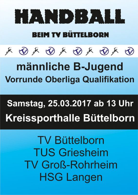 Das Turnier findet in der Kreissporthalle Büttelborn statt und beginnt um 13.00 Uhr. Für das leibliche Wohl ist gesorgt. Unsere Jungs der männlichen B-Jugend freuen sich über viele Fans und Zuschauer, die sie lautstark unterstützen.