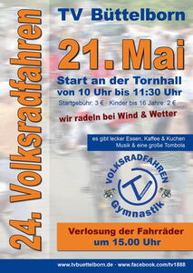 Auf dem Plan steht ein 25 km langer Rundkurs mit zwei Streckenposten, an denen es für die Radler eine kleine Erfrischung geben wird. Unter allen Teilnehmern werden je ein Damen- und ein Herrenfahrrad (finanziert aus Geldspenden Fa. Holzbau Hirsch, Landschaftspflege Klink und Fahrrad-Küchler, Mörfelden) und ein dritter Preis verlost. Die ältesten und jüngsten Teilnehmer, die größte Gruppen extern und vereinsintern werden geehrt. Eine Tombola mit tollen Preisen, hauptsächlich von Landwirten und Geschäftsleuten in und um Büttelborn gestiftet, rundet das abwechslungsreiche Programm ab.