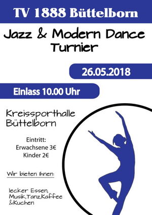 Zum vierten Mal lädt der TV Büttelbon am 26. Mai in der Kreissporthalle Büttelbon zum großen Jazz- und Modern-Dance Turnier ein. Über 600 Teilnehmer werden in Büttelborn bei dieser Veranstaltung erwartet, die sich auf 46 Teams aufteilen. Gastgeber TV Büttelborn ist dabei mit all seinen sieben Mannschaften vertreten, auch die neu gegründete Erwachsenengruppe „Reloaded“ ist mit am Start.