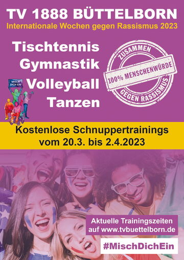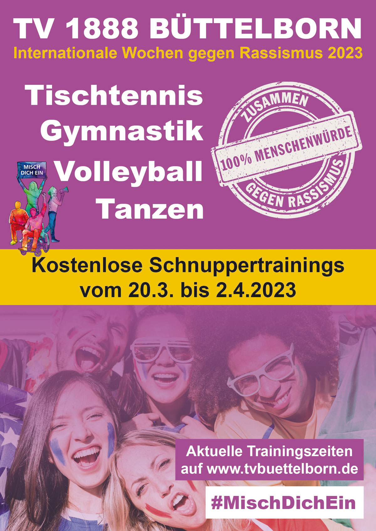 Bei den Internationalen Wochen gegen Rassismus vom 20. März bis zum 2. April ist auch der TV Büttelborn dabei. Unsere Sparten Volleyball, Jazz & Dance und Tischtennis laden Menschen aller Couleur zum kostenlosen Schnuppertraining ein. Die Trainingszeiten könnt Ihr auf unserer Homepage www.tvbuettelborn.de entnehmen.