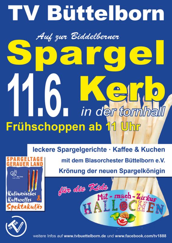 Die nächste Spargelkerb findet am 11. Juni 2017 in der Tornhall statt. Beginn des Frühschoppens mit Bier vom Faß und leckeren Spargelgerichten ist um 11:00 Uhr, das Blasorchester Büttelborn sorgt wieder für die musikalische Unterhaltung. Höhepunkt ist die Krönung der neuen Spargelkönigin. Mit dabei sind außerdem wieder die Kerweborsch vun den Tornhall und ein Spargelschäl-Wettbewerb wird es auch geben.