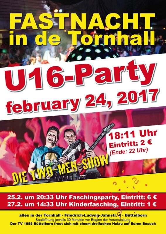 Zum zweiten Mal lassen wir es am Freitag vor der Fastnacht für jüngeren Vereinsmitglieder krachen: die Teenie-Disco für alle von 10 bis 15 Jahre am Freitag vor der Fastnacht von 18.11 Uhr bis 22 Uhr in der Tornhall. Einfach mal feiern wie die Großen. Der Eintritt beträgt 2 Euro.