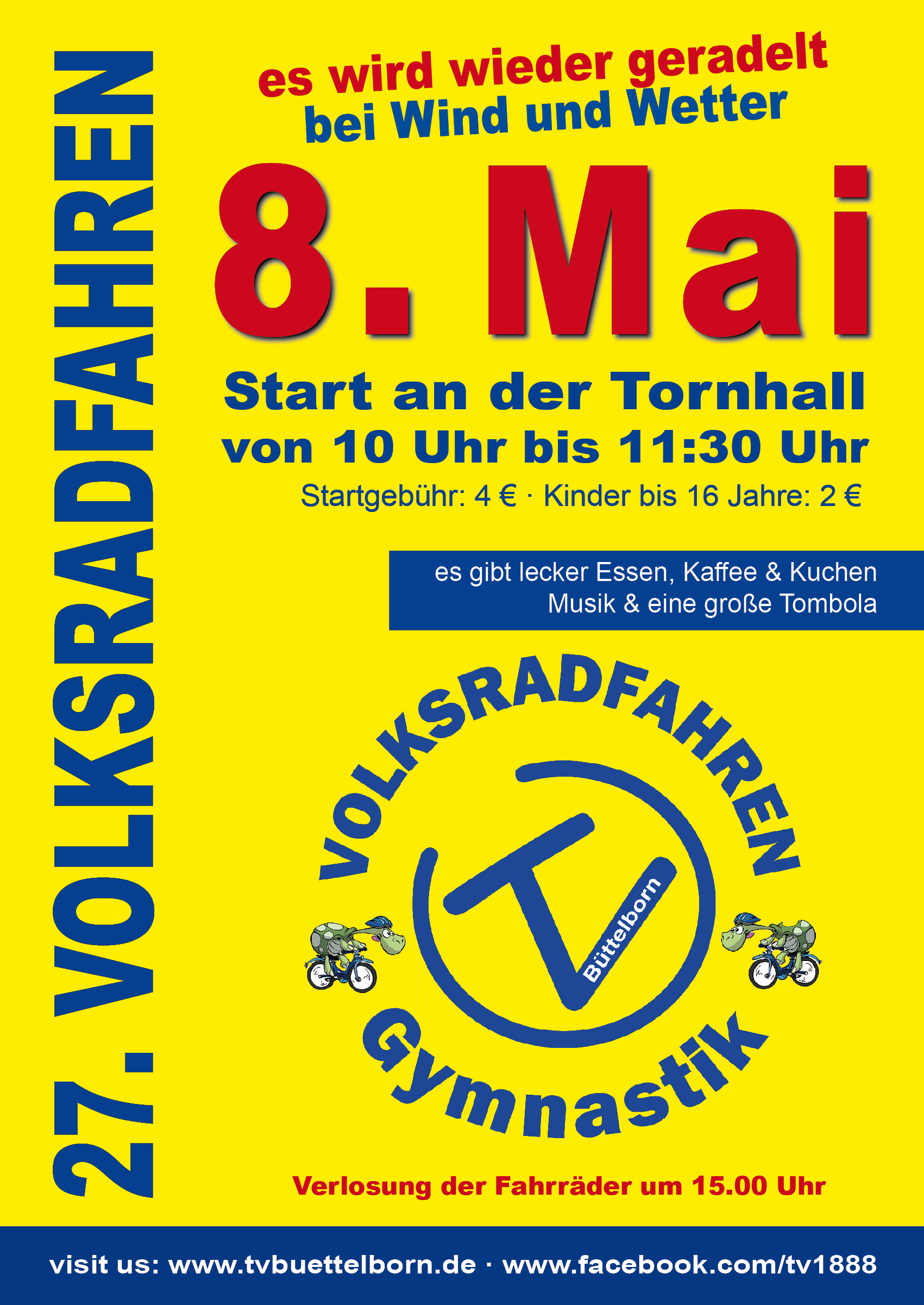 Nach der Rückkehr in die Turnhalle werden sie mit Leckereien vom Grill, kühlen Getränken sowie Kaffee und Kuchen verwöhnt. Um 15.00 Uhr wird es spannend: zunächst werden die ältesten und die jüngsten Teilnehmer und die größte vereinsinterne und externe Gruppe geehrt. Dann werden zwei Fahrräder im Wert von je 600 Euro und ein Laufrad für die Jüngsten unter allen Teilnehmern verlost. Sie werden aus Geldspenden der Firmen Fahrrad Küchler Mörfelden-Walldorf, Holzbau Hirsch und Landschaftspflege Klink finanziert. Ein weiteres Highlight wird auch die Tombola sein, für die Landwirte und Gewerbetreibende in und um Büttelborn die Preise gespendet haben. Der Erlös dieser Tombola geht an das SOS-Kinderdorf Eisenberg/Pfalz, für das die Gymnastikfrauen schon seit 1986, damals angeregt durch Wilma Nau, eine Patenschaft übernommen haben. Allen Spendern, ohne die eine solche Veranstaltung gar nicht möglich wäre, herzlichen Dank! Also: mitmachen lohnt sich auf alle Fälle, denn Radeln mit Freunden und der Familie für einen guten Zweck macht besonders viel Spaß!