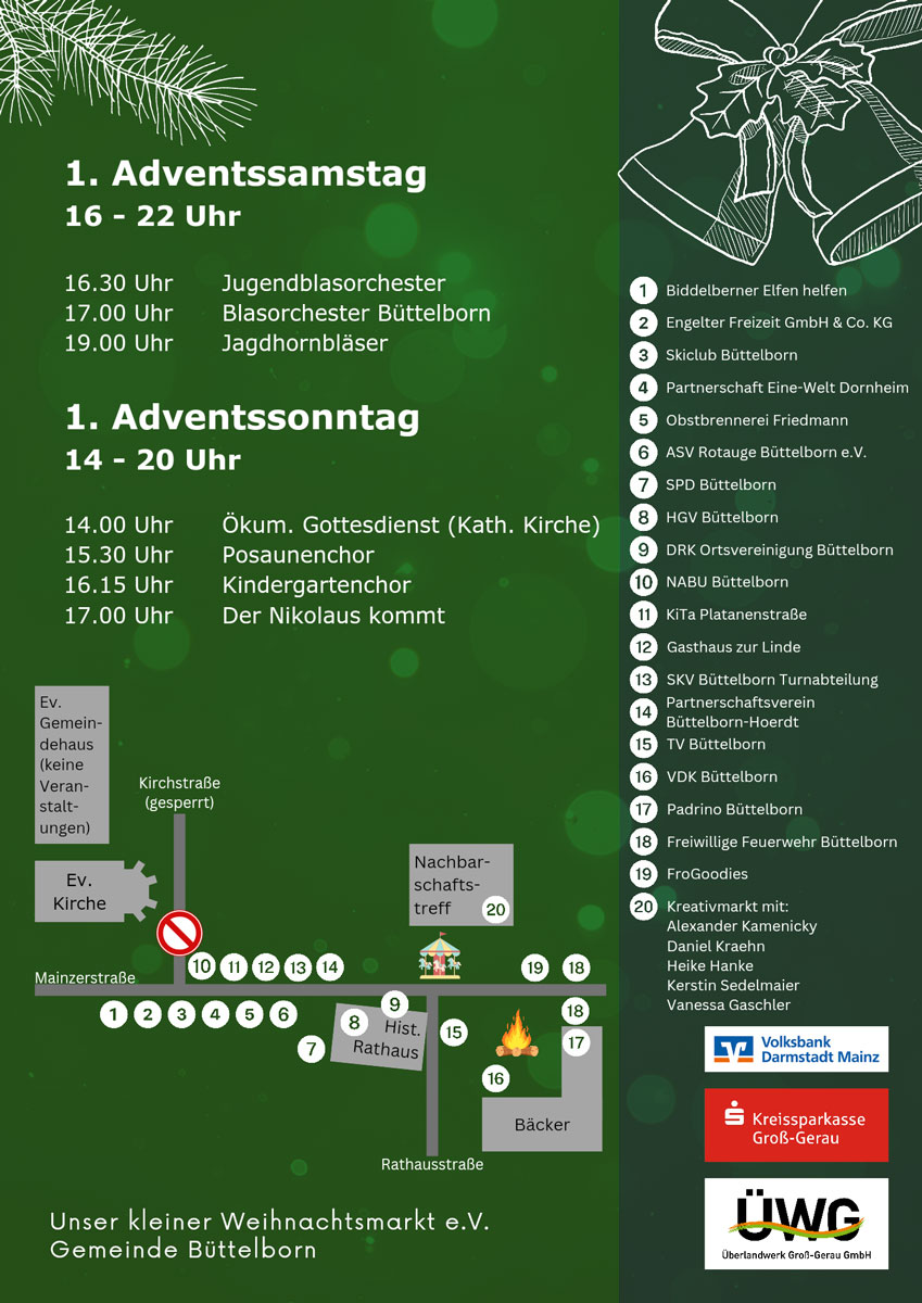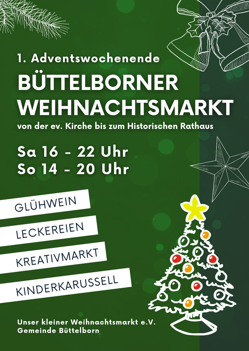 Besucht den kleinen Weihnachtsmarkt am Wochenende des 1. Advent rund um das historische Rathaus. Auch der TV Büttelborn ist mit einem Stand dabei und wird euch mit leckeren Waffeln und Glühwein versorgen.
