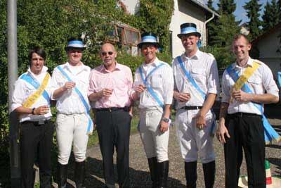 Dahinter marschieren vier Kerweburschen in einer Reihe, aber mehrere Reihen hintereinander. Jeder Bursche mit einer Weinflasche und übergestülptem Glas in der Hand sie haben keine weißen Schürzen an. Sie haben dem Sprecher von ihrem Wein angeboten.