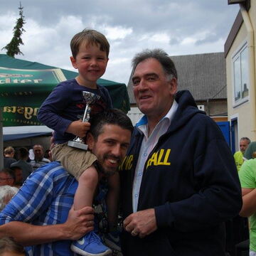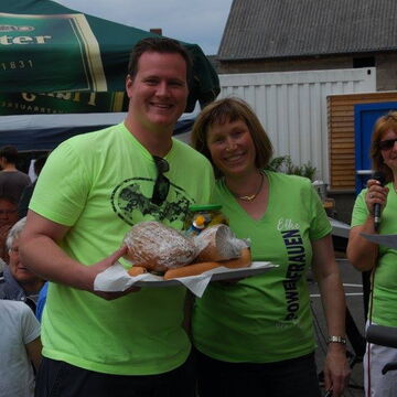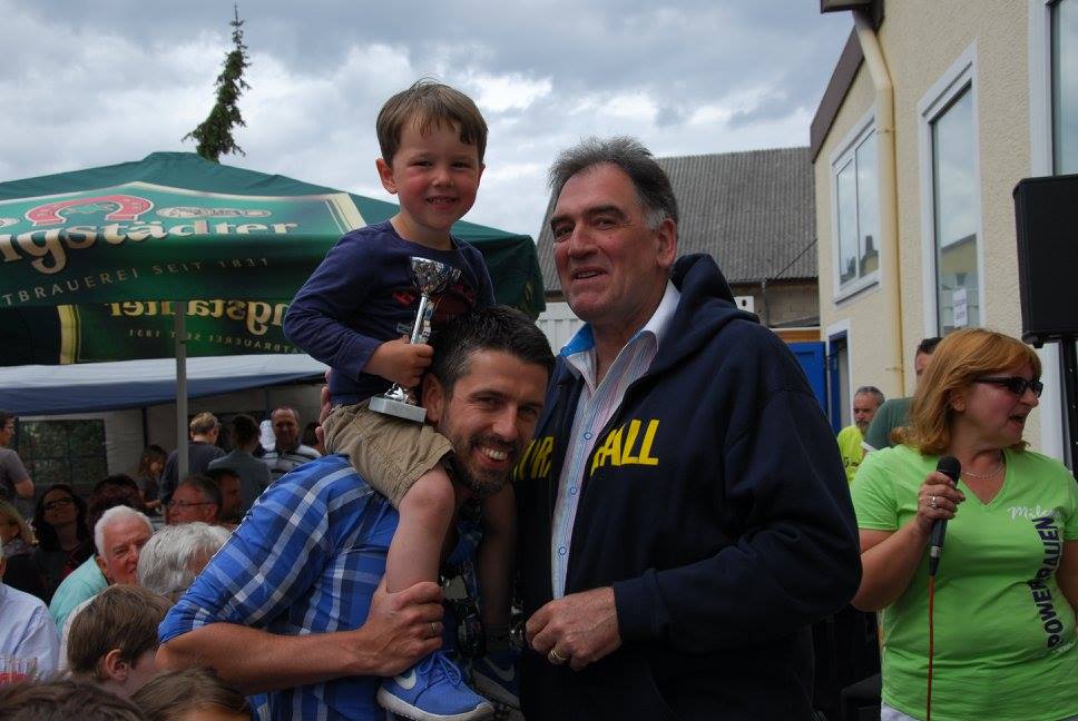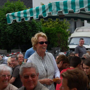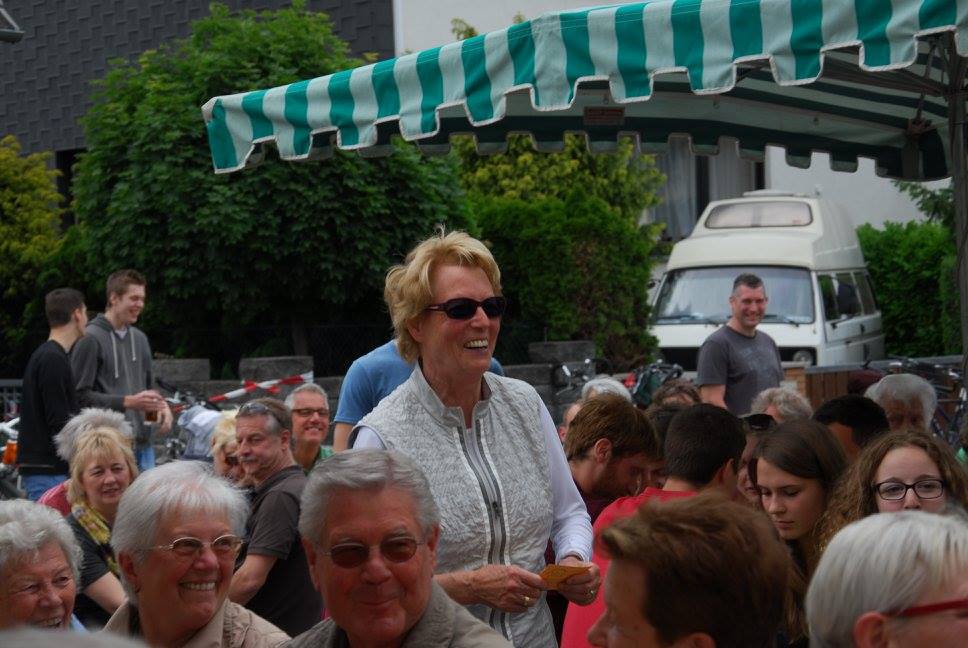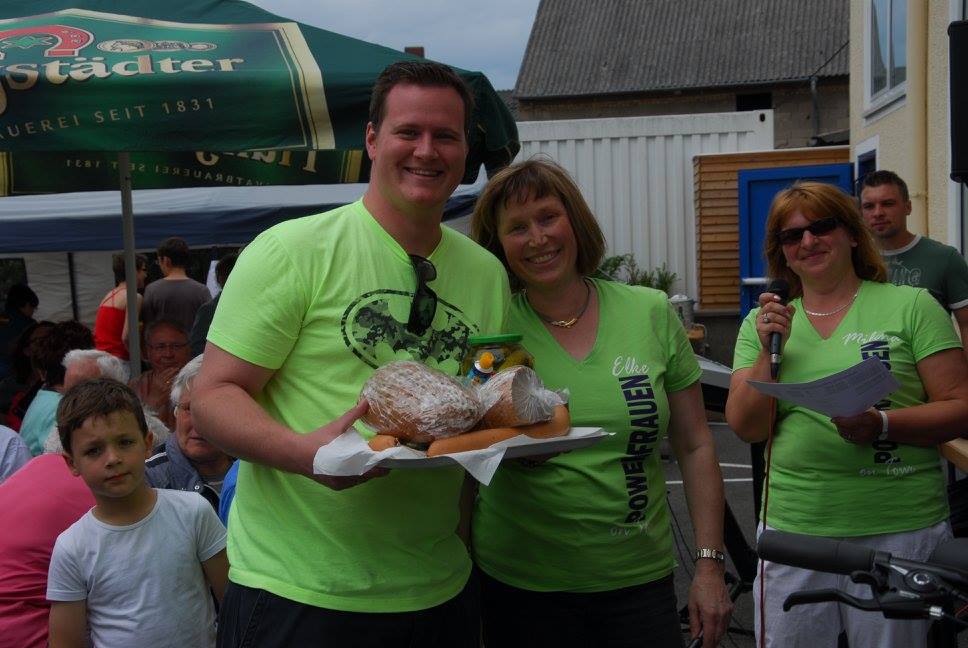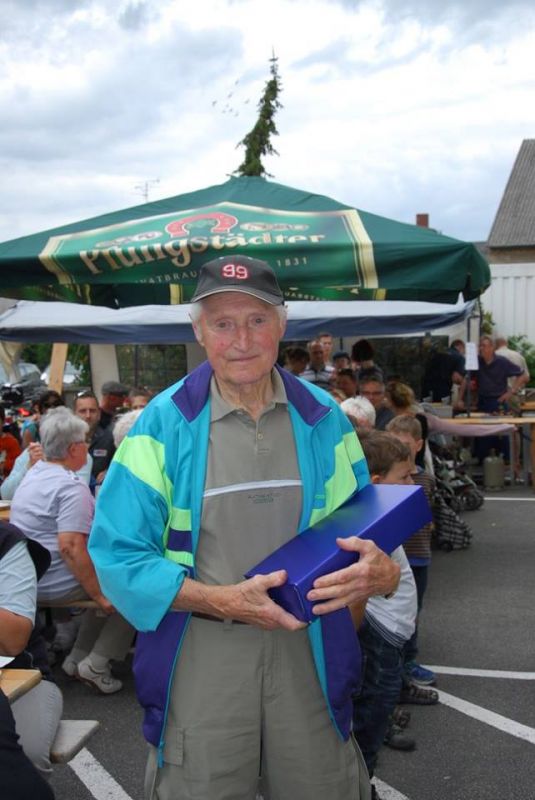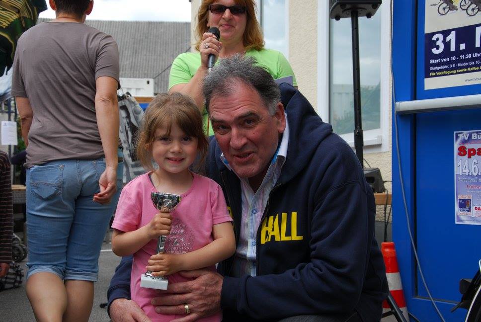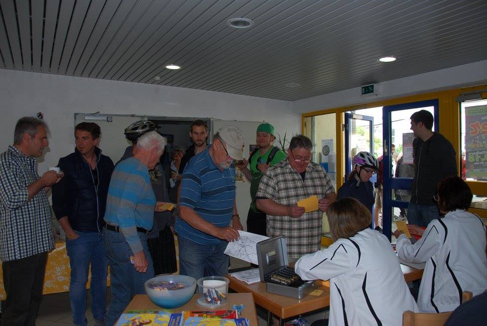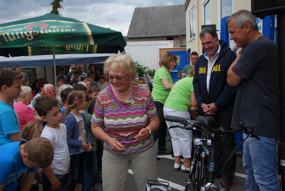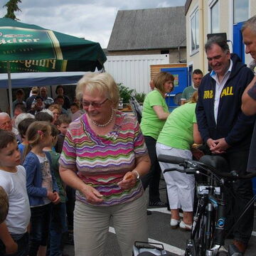 Am Ziel – der Tornhall – wieder angekommen, war das Angebot an Speisen, Getränken und Kuchen groß. Ute Kroiß begrüßte im Auftrag des abwesenden Bürgermeisters die Gäste und bedankte sich, da sie ja auch Teilnehmerin war, bei allen freiwilligen Helfern für die tolle Organisation und die gelungene Veranstaltung. Danach stand die Ehrung verschiedener Teilnehmer bzw. -gruppen auf dem Programm: Die jüngsten Fahrradfahrer waren Elisa Plahuta und Noah Petri, beide 4 Jahre alt, sie erhielten - vom Bürgermeister gestiftet – jeweils einen Pokal für ihre tolle Leistung. Erika Sack war die älteste Teilnehmerin mit 84 Jahren und bekam dafür ein Blumenpräsent. Adam Astheimer (85) erhielt als ältester aktiver Teilnehmer ein Weinpräsent des Weinguts Oswald. Die größte vereinsexterne Gruppe war diesmal die SKV mit 19 Radfahrern und die größte vereinsinterne Gruppe waren die Handballer mit 59 Radlern. Sie erhielten ebenfalls ein Präsent zur Stärkung. Die Spannung stieg, als die Fahrräder, gestiftet von der Firma Fahrrad Küchler Mörfelden-Walldorf, der Firma Holzbau Hirsch und der Firma Landschaftsbau Klink, verlost wurden. Glücksfee war die siebenjährige Alea, die die Gewinner ziehen durfte: Gewinnerin des Damenfahrrads war Marianne Schulz aus Dornheim, das Herrenfahrrad durfte der siebenjährige Nico Schöneberger mit nach Hause nehmen und über den dritten Preis, ein rotes Puky-Laufrad freut sich nun Jan Schneiders kleine Tochter.