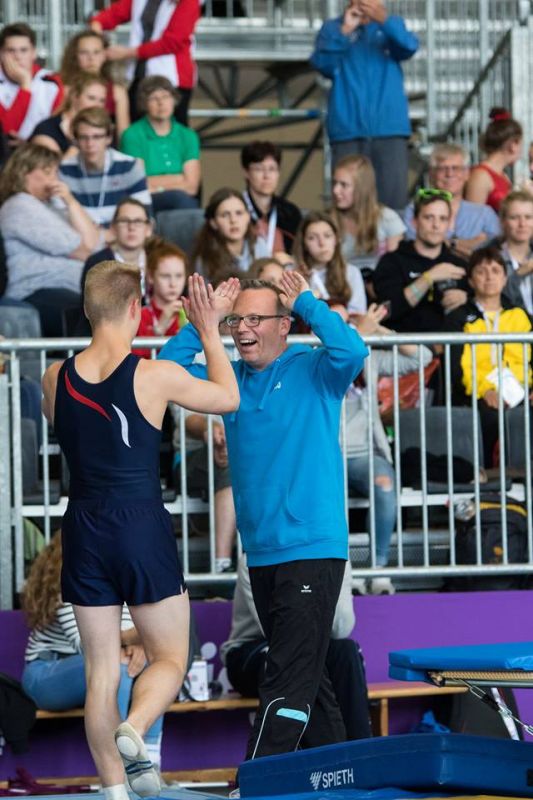 Louis Behre, Deutscher B-Jugend-Champion von 2016, wollte in Berlin wieder aufs Treppchen. Mittlerweile in die A-Jugend aufgerückt, musste Behre sich gegen die durchweg ältere Konkurrenz zur Wehr setzen. Und es sah richtig gut. Platz zwei nach dem Vorkampf – trotz nicht optimaler Vorbereitung auf den Höhepunkt des Jahres. Dann der erste Durchgang im Finale – ein „Voll-ein-Halb“ als Abgang. Hatte beim Einturnen nie geklappt, doch hier stand er das Ding wie eine eins. Die Büttelborner Fans samt Trainer jubeln. Jetzt der letzte Durchgang. Fliffis Aufgang – perfekt getroffen. Jetzt nur noch den „Halb-Halb“ irgendwie runterbringen. Doch Louis geht zu früh in die Schraube, fliegt nach links und landet mit einem Bein neben der Matte. Aus. Nur ein Sprung wird gewertet. Statt Bronze, Silber oder Gold wird es nur Rang sieben.