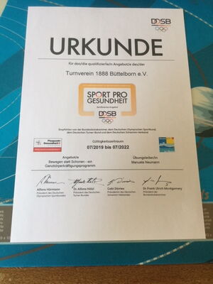 Der TV Büttelborn hat für den Kurs "BEWEGEN STATT SCHONEN" nun den Plusunkt Gesundheit bekommen.