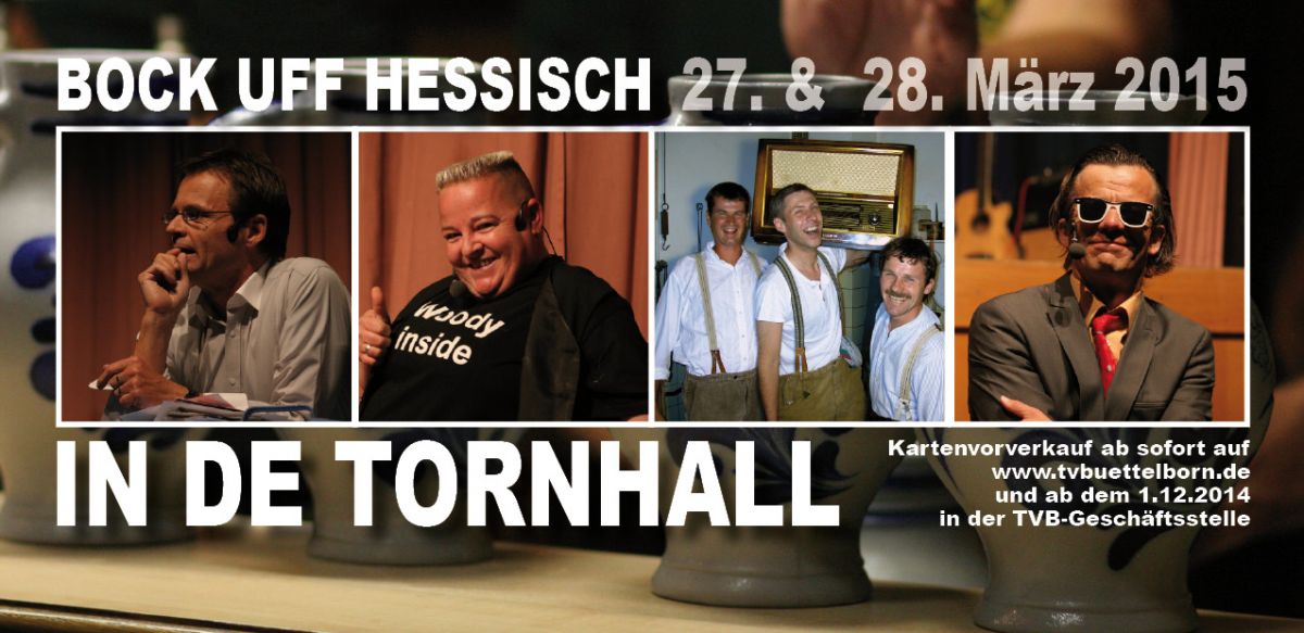 Am 27. und 28. März 2015 gibt es in der Tornhall wieder einen Bock uff Hessisch. Einen Bock wie man ihn kennen und lieben gelernt hat. Mit dabei sind Woody Feldmann, Christian und Udo Döring und die Rhöner Sauwäntzt. Es gibt Äbbelwoi vom Fass, Frankfurter Werschdscher, Handkäs und Kochkees, Brezele, Tafelspitz – hessischer geht’s net.