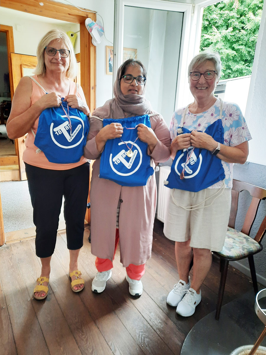 Der 7. August stand dann im Zeichen von Olympia. Auf dem alten Sportplatz an unserer Tornhall hatten wir sechs sportlich-spaßige Stationen aufgebaut. Bei Eierlauf, Teebeutelweitwurf, Ringe werfen, Wasserpistole schießen, Bälle in die Olympischen Ringe werfen und mit Sand gefüllte Flaschen umkegeln ging es um Medaillen. Als alle ihre Übungen absolviert hatten, gingen wir in die Gaststätte „Zur Linde“, wo wir uns nach der Anstrengung stärken konnten. Gerda legte für uns Steaks und Würstchen auf den Grill, dazu gab es leckere Salate und Weißbrot. Dann wurde es spannend, die Siegerehrung stand bevor. Wer hatte die Medaillenplätze erreicht? Den dritten Platz und somit Bronze erreichte Helga Kappler. Die Silbermedaille ging an Elke Deußer. Auf dem (gedachten) Treppchen in der Mitte – also Gold – stand mit dem besten Ergebnis Laeeqa Ahmad. Aber nicht nur die drei ersten bekamen ihre Medaillen, es gab für jede der Teilnehmerinnen ein kleines Geschenk für die Teilnahme. Das Orga-Team bedankt sich auch bei den Helfern aus Helgas Familie an den Stationen. Jenny, Amelie und Hans-Peter bekamen für ihren Einsatz je einen Gutschein für die Eisdiele am Rathausplatz.