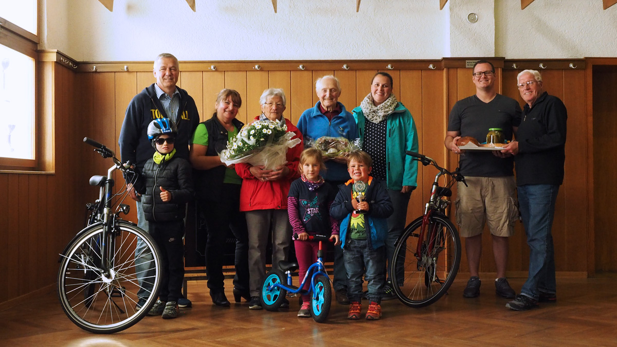 Else Funk war die älteste Teilnehmerin mit 84 Jahren und bekam dafür ein Blumenpräsent. Philipp Engel hält mit seinen 93 Jahren schon seit dem Jahr 2000 den Spitzenplatz des ältesten Teilnehmers beim Volksradfahren. Er erhielt ein Wurst-Präsent. Die jüngsten Fahrradfahrer waren Emilia Holewic (5) und Maximilian Gärtner, 3 Jahre alt, sie erhielten jeweils einen Pokal für ihre tolle Leistung. Größte vereinsexterne Gruppe waren wieder die Naturfreunde mit 23 Radfahrern und die größte vereinsinterne Gruppe die Handballer mit 57 Teilnehmern. Sie erhielten ebenfalls ein Präsent zur Stärkung.