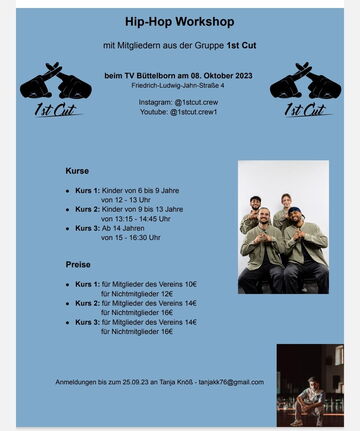 Achtung: jetzt noch anmelden für den Hip-Hop-Workshop am 08.10.2023 bei Mitgliedern der 1stcut - Crew. Diese Gruppe ist auf diversen großen Bühnen mit ihren Tänzen zu sehen und gibt ihr Wissen und Können regelmäßig an andere Interessierte weiter. So werden sie im Oktober auch zu uns kommen und drei unterschiedliche Kurse für jedes Alter leiten.