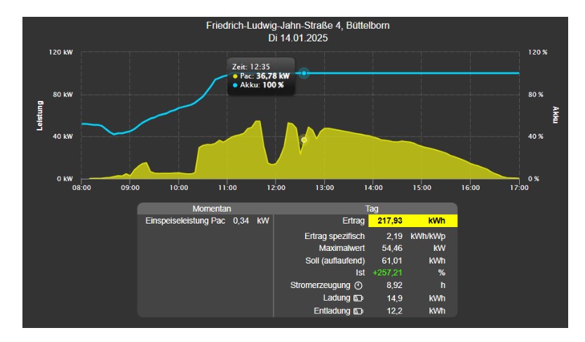 Dank einer hauseigenen Visualisierung besteht die Möglichkeit, das Speichergeschehen sogar live und in Farbe in SolarSTARK View beobachten zu können. Hier werden die Be- und Entladevorgänge in Echtzeit dargestellt und statistisch ausgewertet. Die ersten Tage im neuen Jahr zeigte der Speicher bereits vollen Einsatz und wurde effizient genutzt.