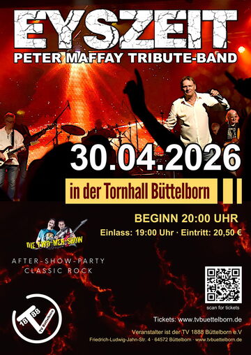 Noch bis zum 6.12.2025 gibt es 10% Rabatt für Tickets für das Konzert der Peter-Maffay-Tribute-Band "EYSZEIT" mit Leadsänger Reiner Vogl am 30.04.2026 in der Tornhall. Die Aktion haben wir verlängert, da es in den letzten Tagen zu Störungen der Homepage gekommen ist.